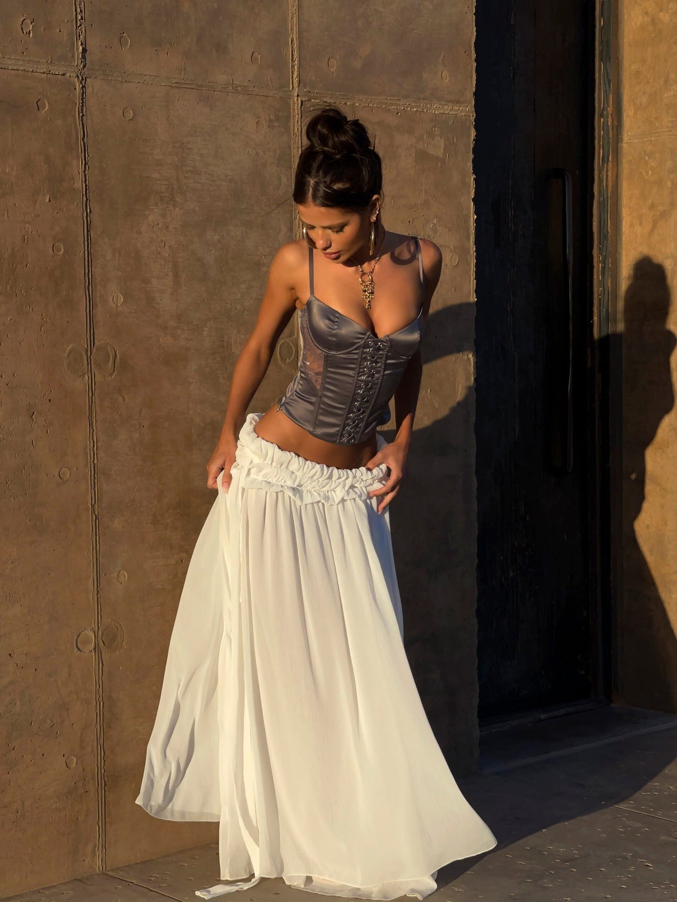 Command attention in the Sade Corset Top in Steel. Crafted from sleek satin, this structured corset features boning for a sculpted fit, while silver eyelets and crisscross lacing add an edgy touch. Lace panel detailing enhances the look, bringing a bold yet feminine contrast. Finished with a back zipper closure, this s