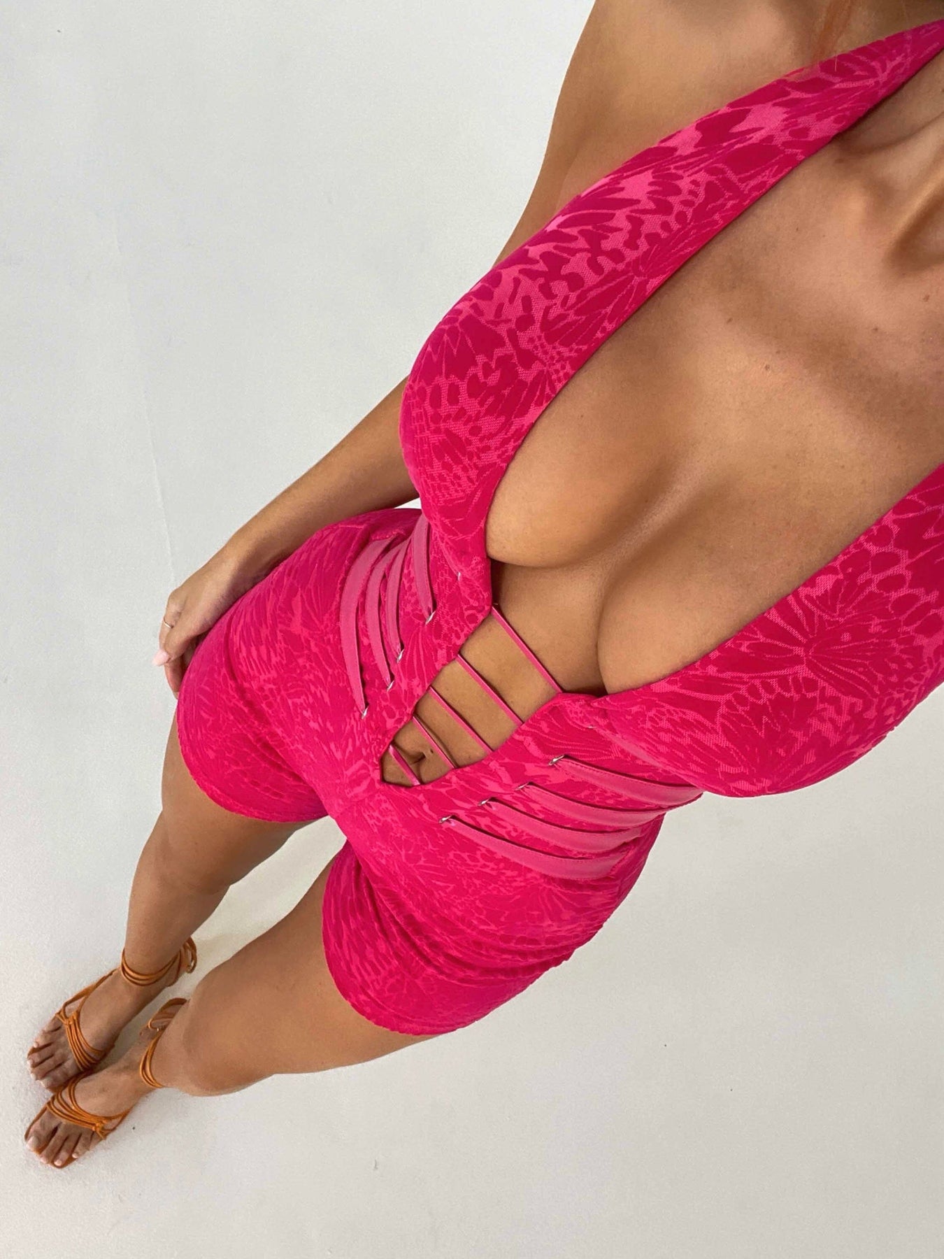 Ultra-chic and sexy wearing our 'Sawyer Playsuit' in Pink Burnout. Crafted from our signature burnout fabrication, this flattering playsuit showcases all of your best assets. Featuring a low-cut neckline, lined mesh and an adjustable halter necktie feature! Completed with PU strap detailing at the waist with eyelet har