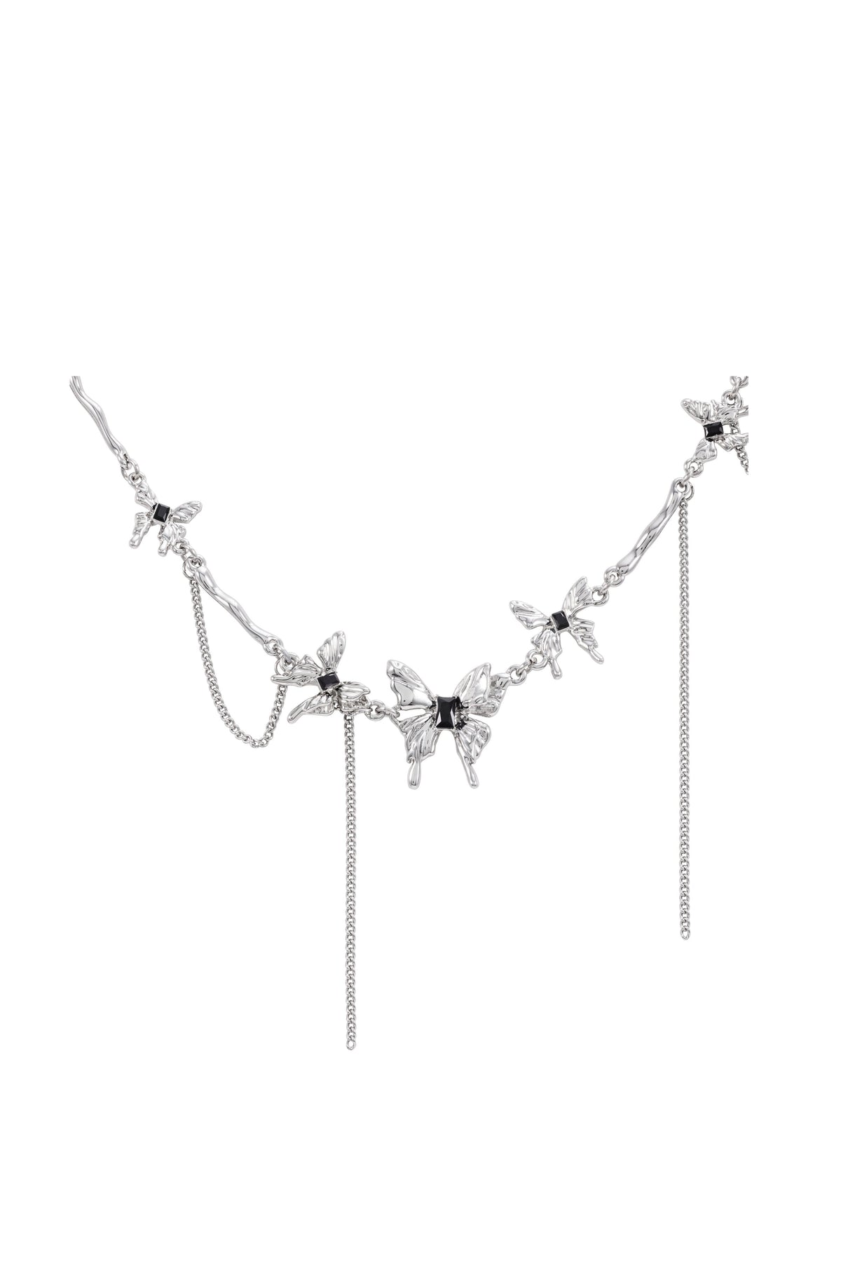 Discover the allure of platinum-plated jewellery that's as distinct as you are, introducing our 'Utopia Necklace' in Silver. Utopia features butterfly charms throughout, adorned with black crystals to add further edge to the design. She has a clasp closure for easy on-off and is complete with drop down silver chains th